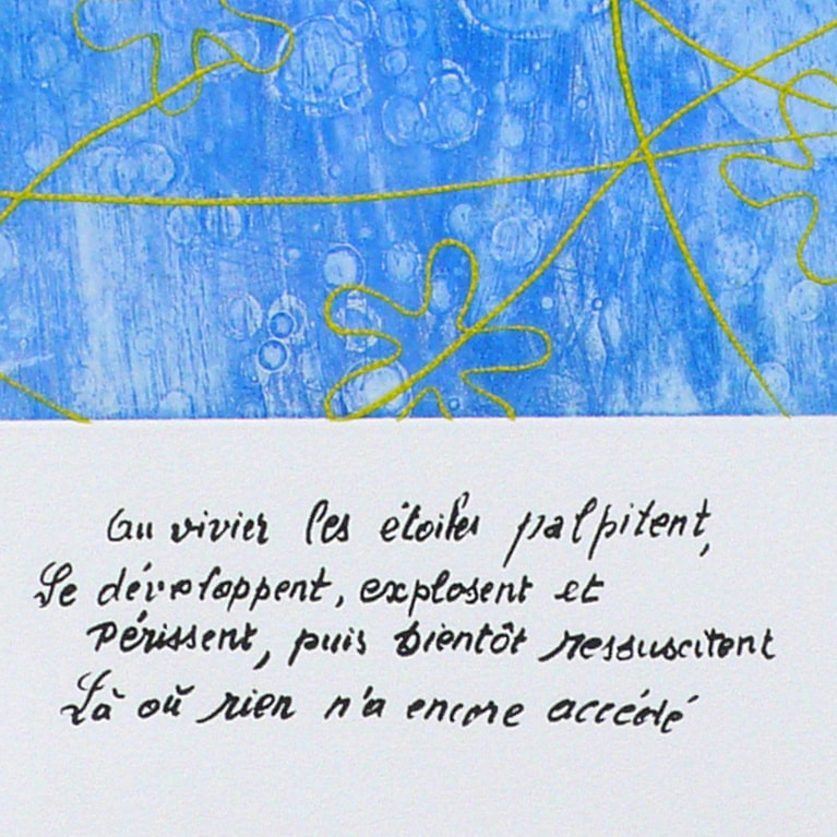 Soon after that, Hector Saunier, the Director of the Atelier Contrepoint, who was my supervisor there at that time, somehow knew of my interest in Robert and kindly organised an opportunity for me to show my works to him at the Atelier. After viewing my collection of poems and prints entitled ‘Itoyu’, Robert told me, ‘If you want to collaborate, let’s start immediately. I will write poems for your pictures’ and offered me his hand. It surprised me immensely to hear such words from this eighty-four-year old great master, for he was very well known and respected in both the French and the international literary worlds. However, his proposal of ‘creating together a collection of poems and pictures that will be free from any conventional ideas’ made me decide to create a collection that could express ‘utsuroi’, that is, something that I felt in Paris. This work would be based on my own theme: ‘time cycling in life’.
